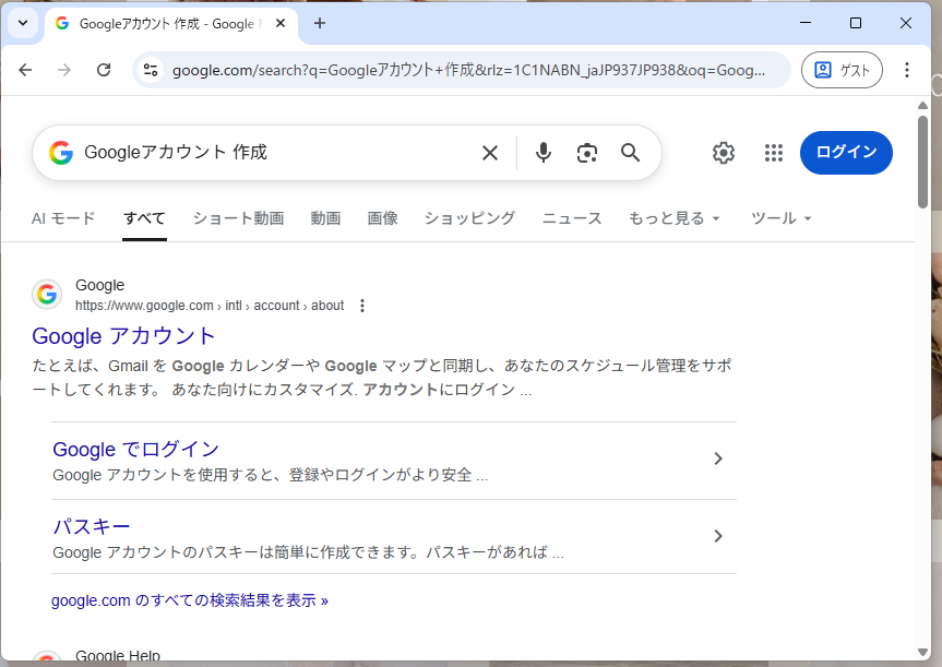 お使いのブラウザを開いたら、検索バーに「Googleアカウント 作成」と入力してください。
